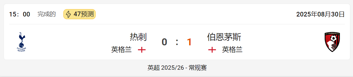 80块钱一张 2025年08月30日热刺伯恩茅斯:足球比赛概述与实时更新 热刺 (英格兰) 与 伯恩茅斯 (英格兰) 之间的足球比赛于星期六 2025年08月30日 在 15:00 结束,比分为1 : 0,有利于 伯恩茅斯。这场比赛是 常规赛 的一部分英超 2025/26。 由于比赛已经结束,因此热刺对阵伯恩茅斯的投注已不再接受和可用。