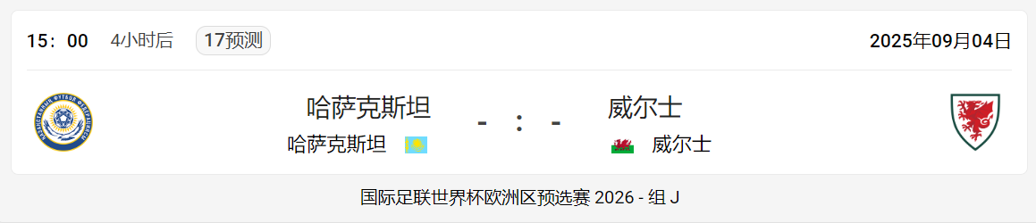 预测比赛 2025年09月04日哈萨克斯坦威尔士:足球比赛概述与实时更新 组 J阶段的国际足联世界杯欧洲区预选赛 2026即将开始,又将有一场足球比赛。哈萨克斯坦 (哈萨克斯坦)对阵威尔士 (威尔士)定于星期四 2025年09月04日进行,所以记得在15:00调整频道。 根据哈萨克斯坦对阵威尔士的赔率列表,比赛中没有明显的优势方,哈萨克斯坦获胜的几率为14%,而威尔士获胜的几率为60%。