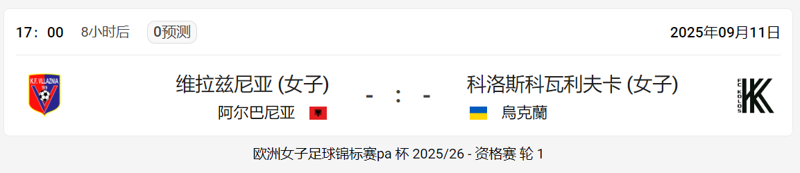 体育娱乐 2025年09月11日维拉兹尼亚 (女子)科洛斯科瓦利夫卡 (女子):足球比赛概述与实时更新 资格赛 轮 1阶段的欧洲女子足球锦标赛pa 杯 2025/26即将开始,又将有一场足球比赛。维拉兹尼亚 (女子) (阿尔巴尼亚)对阵科洛斯科瓦利夫卡 (女子) (烏克蘭)定于星期四 2025年09月11日进行,所以记得在17:00调整频道。
