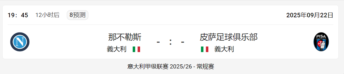 体育上课 2025年09月22日那不勒斯皮萨足球俱乐部:足球比赛概述与实时更新 常规赛阶段的意大利甲级联赛 2025/26即将开始,又将有一场足球比赛。那不勒斯 (義大利)对阵皮萨足球俱乐部 (義大利)定于星期一 2025年09月22日进行,所以记得在19:45调整频道。 书籍商认为,根据那不勒斯 对 皮萨足球俱乐部 的赔率列表,那不勒斯 明显是最受青睐的。据估计,那不勒斯 有 72% 的赢得足球比赛的几率,而 皮萨足球俱乐部 是弱者,力争获得 9% 的胜算,以及 19% 的平局几率。