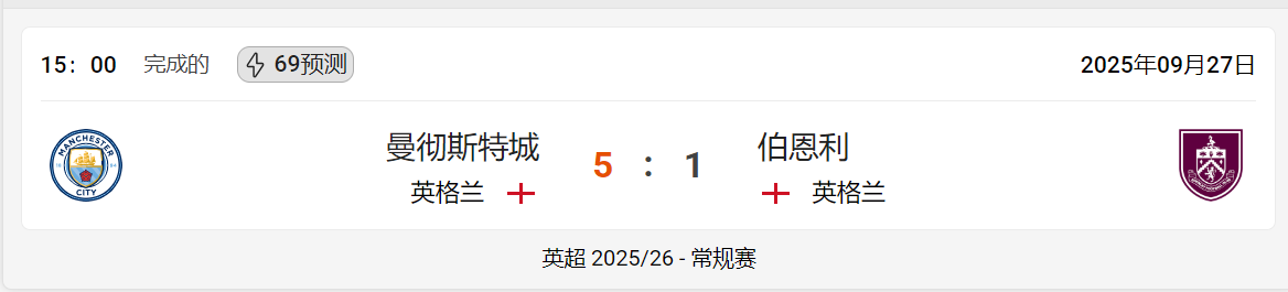 体育网福利 2025年09月27日曼彻斯特城伯恩利:足球比赛概述与实时更新 曼彻斯特城 (英格兰) 与 伯恩利 (英格兰) 之间的足球比赛于星期六 2025年09月27日 在 15:00 结束,比分为5 : 1,有利于 曼彻斯特城。这场比赛是 常规赛 的一部分英超 2025/26。 由于比赛已经结束,因此曼彻斯特城对阵伯恩利的投注已不再接受和可用。