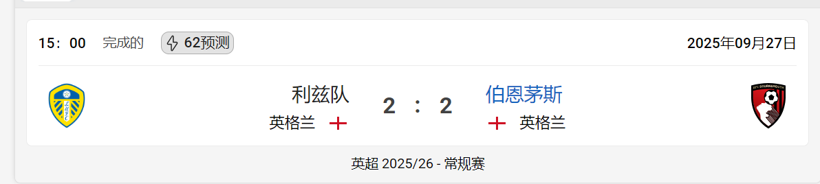 体育网福利 2025年09月27日利兹队伯恩茅斯:足球比赛概述与实时更新 常规赛 英超 2025/26 中 利兹队 (英格兰) 和 伯恩茅斯 (英格兰) 之间的足球比赛于 星期六 2025年09月27日 结束,时间为 15:00。比赛以 2 : 2 的比分打成平局。 由于比赛已经结束,因此利兹队对阵伯恩茅斯的投注已不再接受和可用。