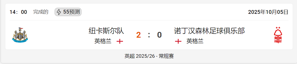 80块钱一张 2025年10月05日纽卡斯尔队诺丁汉森林足球俱乐部:足球比赛概述与实时更新 纽卡斯尔队 (英格兰) 与 诺丁汉森林足球俱乐部 (英格兰) 之间的足球比赛于星期日 2025年10月05日 在 14:00 结束,比分为2 : 0,有利于 纽卡斯尔队。这场比赛是 常规赛 的一部分英超 2025/26。 由于比赛已经结束,因此纽卡斯尔队对阵诺丁汉森林足球俱乐部的投注已不再接受和可用。