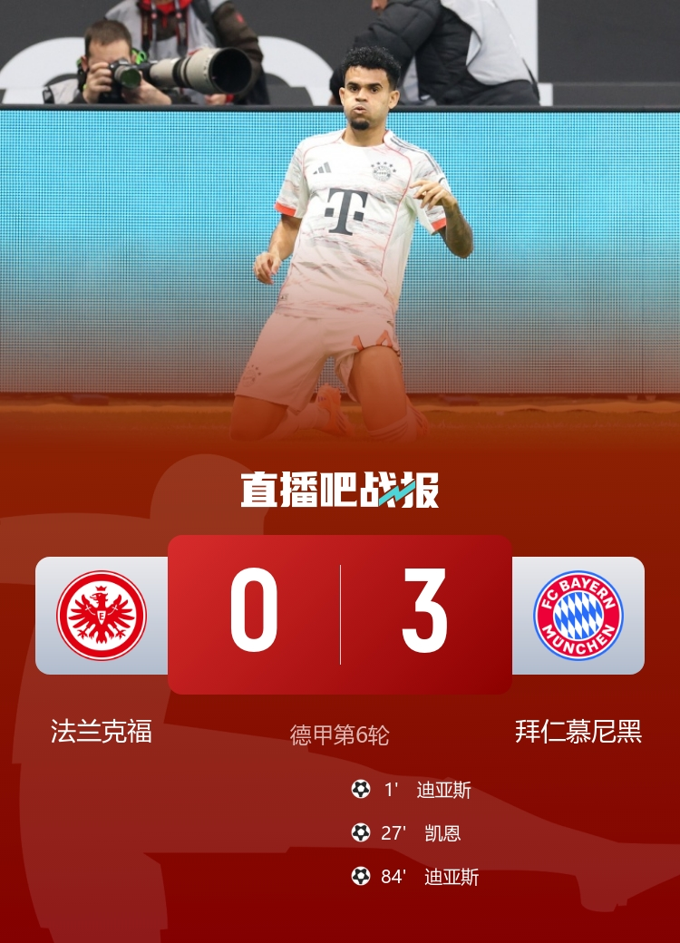 2025-26賽季德甲聯賽第6輪迎來了法蘭克福與拜仁的較量,比賽在德意誌銀行公園球場展開。上半場,拜仁迅速占據主動,格納布裏在第1分鐘助攻路易斯-迪亞斯完成快速破門,幫助球隊取得1-0領先。隨後,法蘭克福的巴霍亞的進球因堂安律在接球時手球被判無效。隨後,凱恩接到了路易斯-迪亞斯的傳球,趁機在第27分鐘以一記低射擴大比分,拜仁在半場結束時以2-0領先法蘭克福。